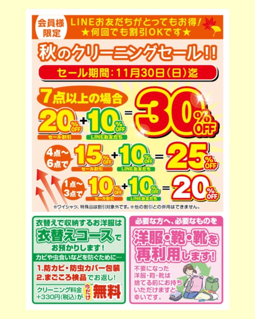 秋のクリーニングセール お得なキャンペーン中LINEお友達限定、11月末まで😍❣️セール割引+LINE友達割引!! 持ってきていただいた数により割引率が変わります!期間中でしたら何回でもご利用出来ますので この機会にぜひ!